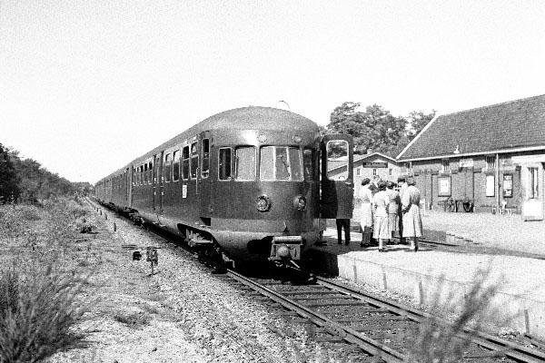 10. Ommen, eerste helft jaren 50 van de vorige eeuw. Een DE5-treinstel op weg van Zwolle naar Emmen. Waarschijnlijk een extra trein, want normaal was een DE1 of DE2 genoeg voor deze lijn. Rechts in de achtergrond de garage van N.V. Salland, een van de voorlopers van busbedrijf Connexxion.