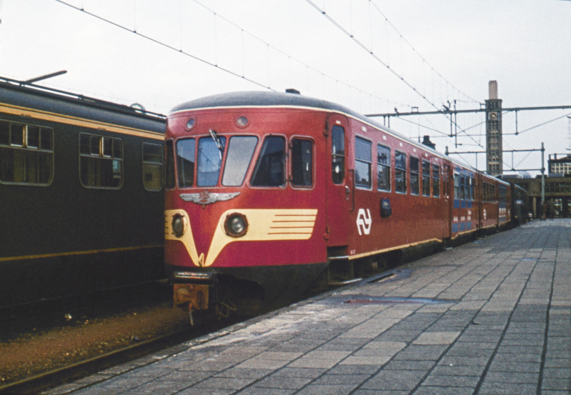 26. Het dieselelektrisch treinstel Mat. '41 - Plan X - beter bekend als 'Blauwe Engel' werd na 1958 rood geschilderd. Tot 1985 deden de stellen nog volop in deze kleur dienst op de secundaire lijnen in het noorden, oosten en zuiden (Zuid-Limburg) van Nederland. Station Zwolle. Datering: Circa 1980. Foto: Rob Dammers - nl.wikipedia.org - Licentiestatus: CC BY 2.0