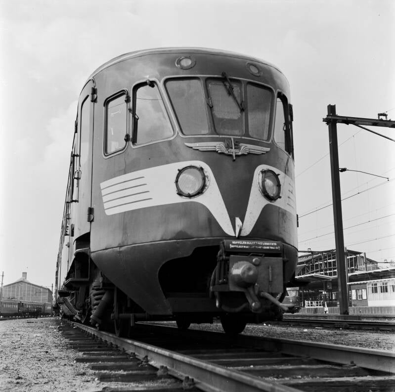 10. Catalogusnummer: 151201. De kop van een diesel-electrisch treinstel DE 2 (serie 61-106/Blauwe Engel) van de N.S. bij de werkplaats te Zwolle. Datering: 20 september 1962. Foto: Nederlandse Spoorwegen - Het Utrechts Archief / hetutrechtsarchief.nl Licentiestatus: CC0 1.0 Publiek Domein Verklaring