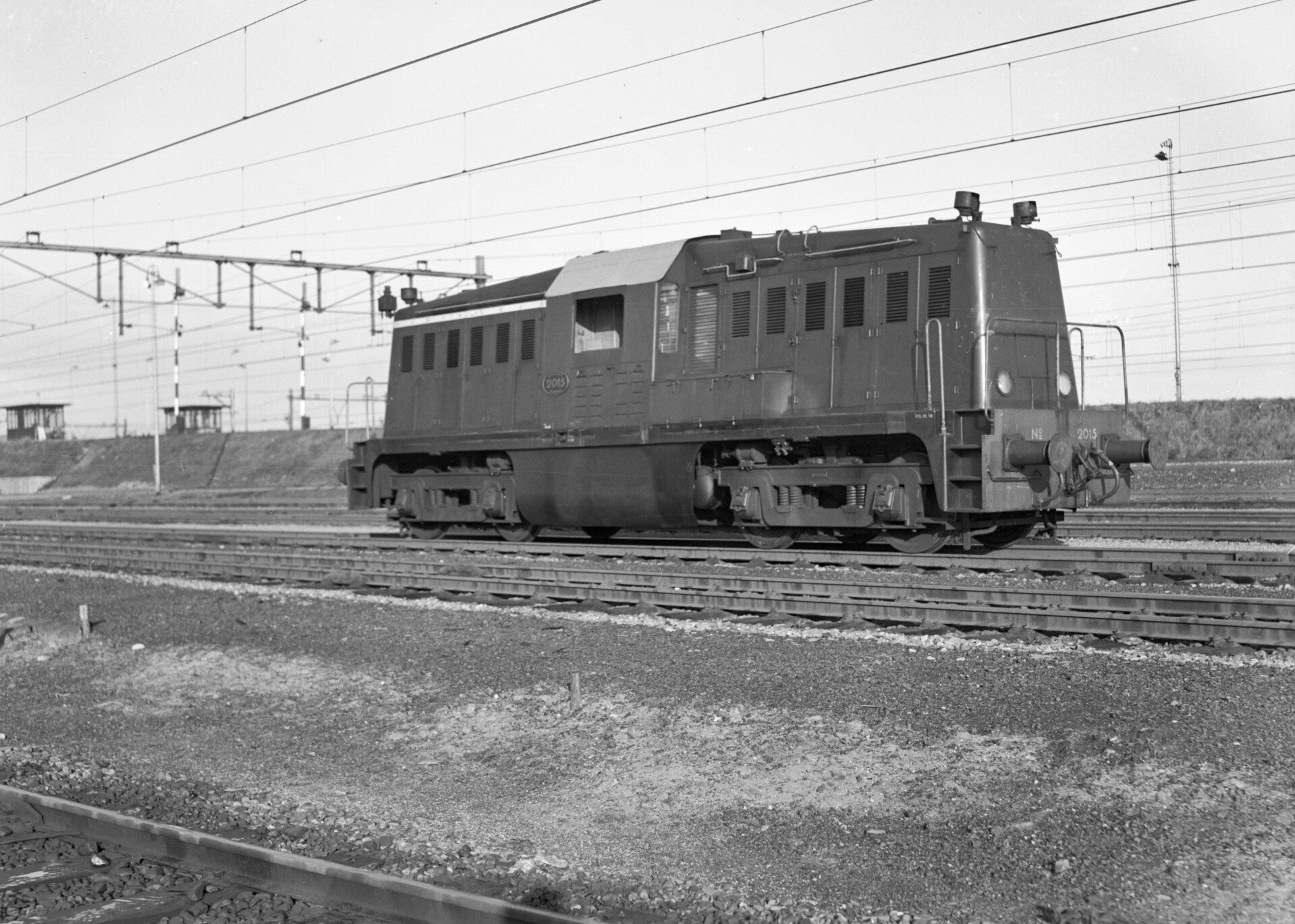 7. Catalogusnummer: 160439. Diesel-electrische locomotief NS 2015 (serie NS 2000) op het rangeerterrein Watergraafsmeer te Amsterdam. Datering: 11 januari 1957. Foto: D.C. Gerdessen, Nederlandse Spoorwegen - Het Utrechts Archief / hetutrechtsarchief.nl