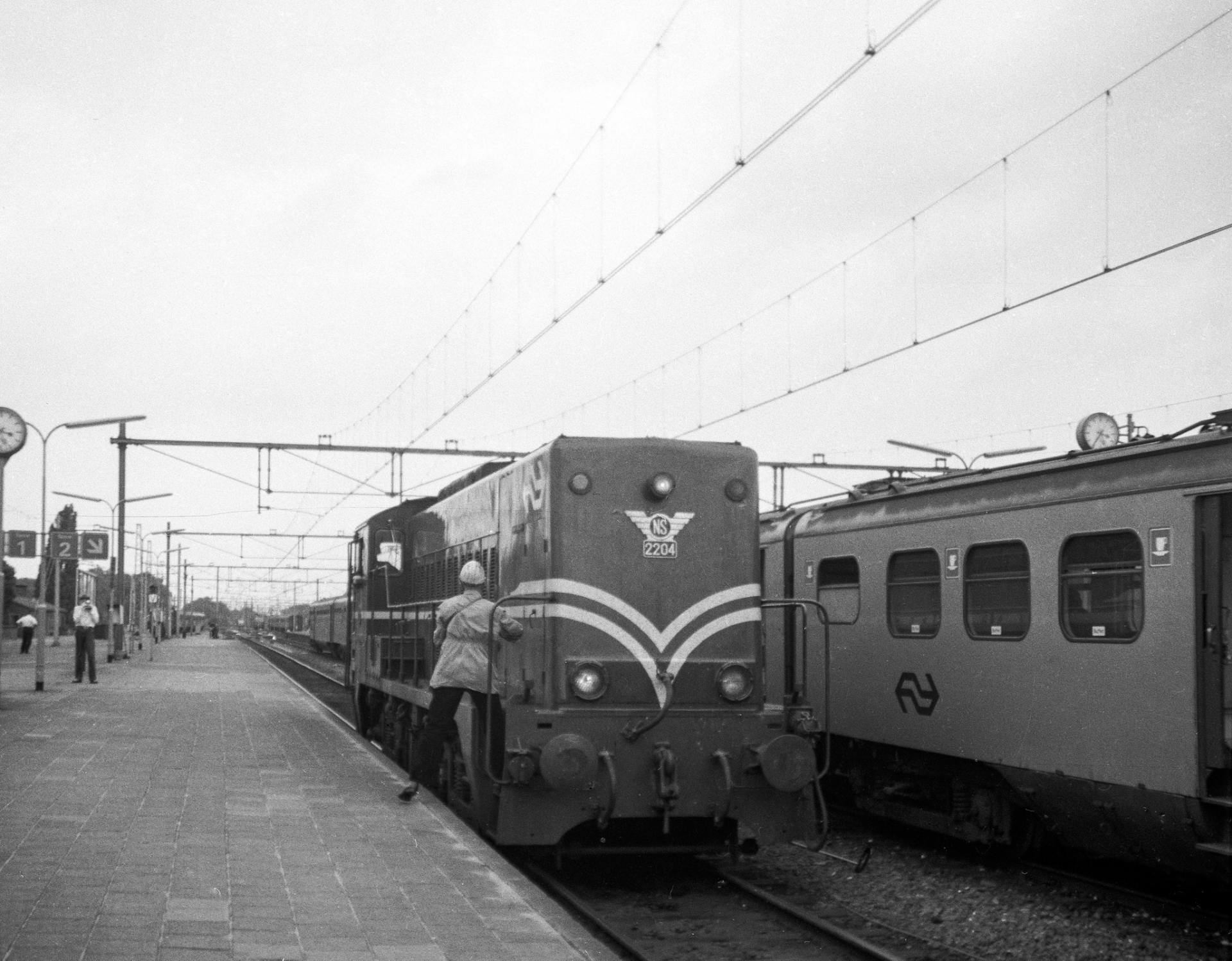 3. Diesellocomotief NS 2204 nog zonder zwaailicht maar wel met A sein voor inzet op grensbaanvakken. Op de tweede spoor staat een elektrisch treinstel Mat. '54. Datering: Enschede 1971.