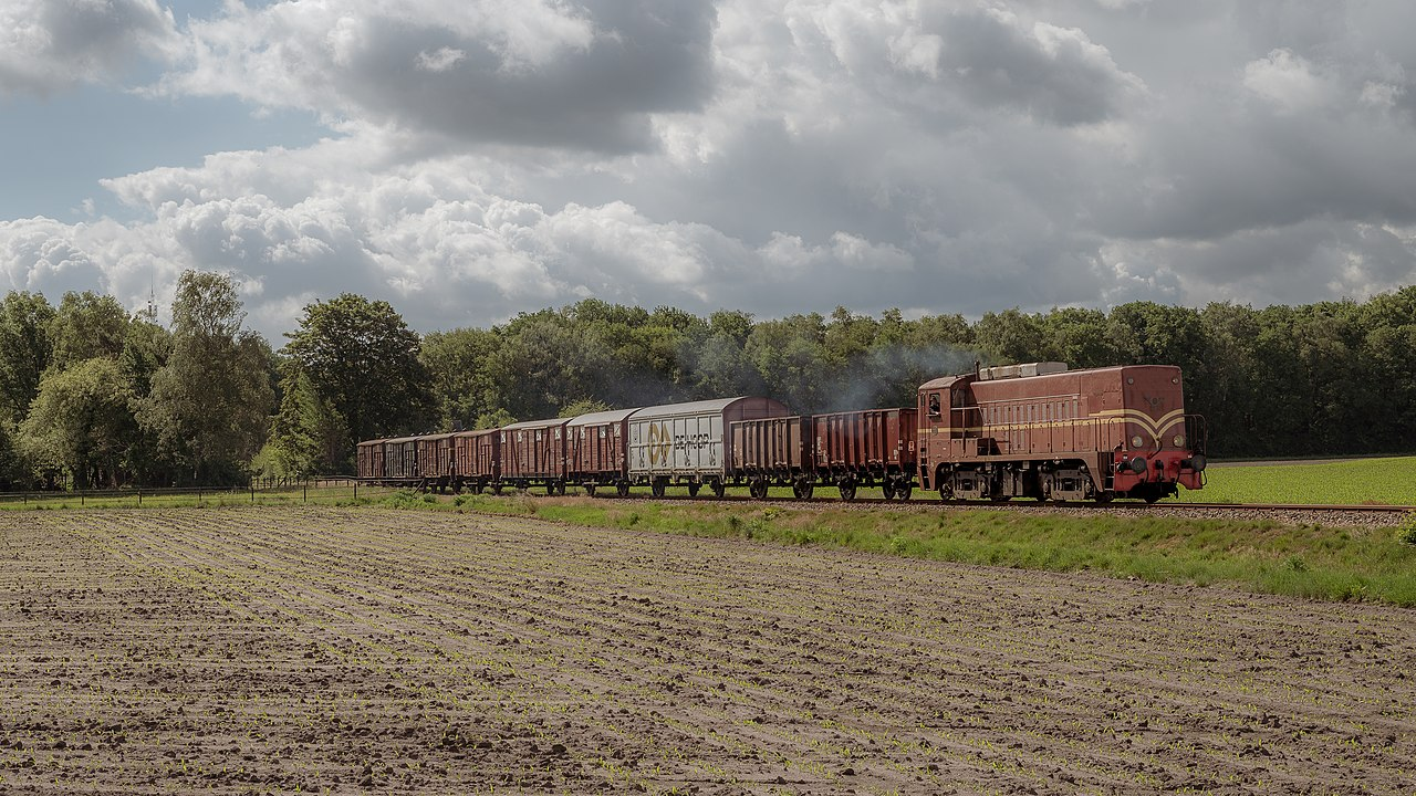 57. Op Hemelvaartsdag 2022 reed onder meer de Veluwse Stoomtrein Maatschappij (VSM) met een uitgebreide dienstregeling. Een dag met 'dramatisch' mooie bewolking, waar regelmatig het zonnetje doorheen prikte. De voormalige diesel-electrische locomotief NS 2233 maakt in de ochtend enkele slagen met een goederentrein, hier bij Lieren onderweg van Loenen naar Beekbergen.