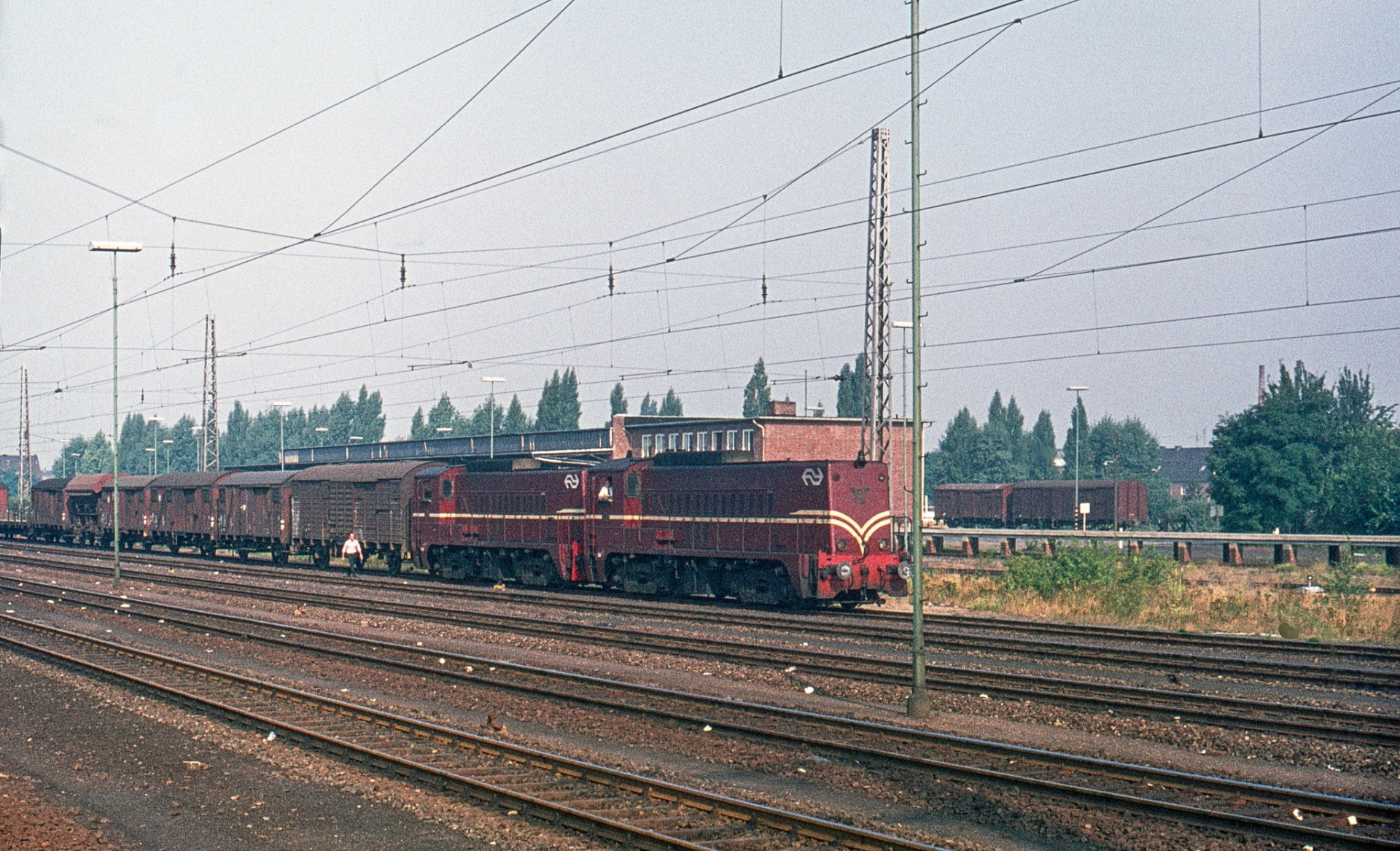 9. Viermaal een diesellocomotief uit de serie NS 2200 en helemaal links op de achtergrond een e-loc uit de serie NS 1100 in Berlin Blauw. Datering: Emmerich omstreeks 1977. Foto: Ben Wiskerke, collectie Hans Wiskerke - Oude NS Treinen (FB)