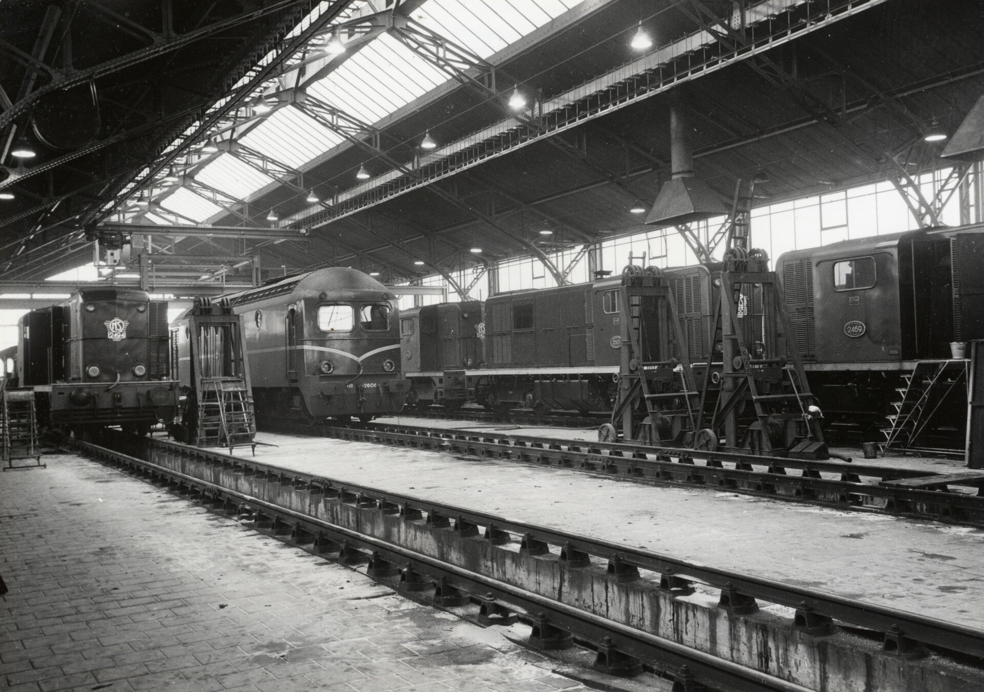 9. Catalogusnummer: 159367. Interieur van de lijnwerkplaats van de N.S. te Eindhoven met van links naar rechts de diesel-electrische locomotieven NS 2494 (serie NS 2400/2500), NS 2606 (serie NS 2600), NS 2457, NS 2501 en NS 2469 (serie NS 2400/2500).