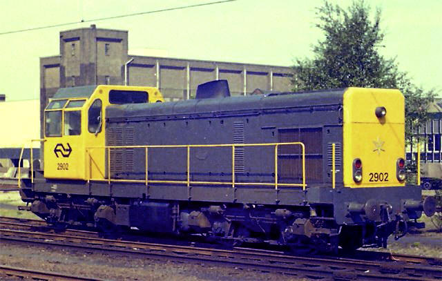 7. Zwolle, 4 augustus 1973. Dieselloc NS 2903. De ramen van de cabines lopen tot schuin in het dak door. Bij de Staatsmijnen was dat belangrijk omdat de machinisten ook goed naar boven moesten kunnen kijken. De machinisten van de NS waren er minder blij mee, want die regenden nat als ze met open raam reden. Dieselloc NS 2901 had een iets hoger dak dan de andere.