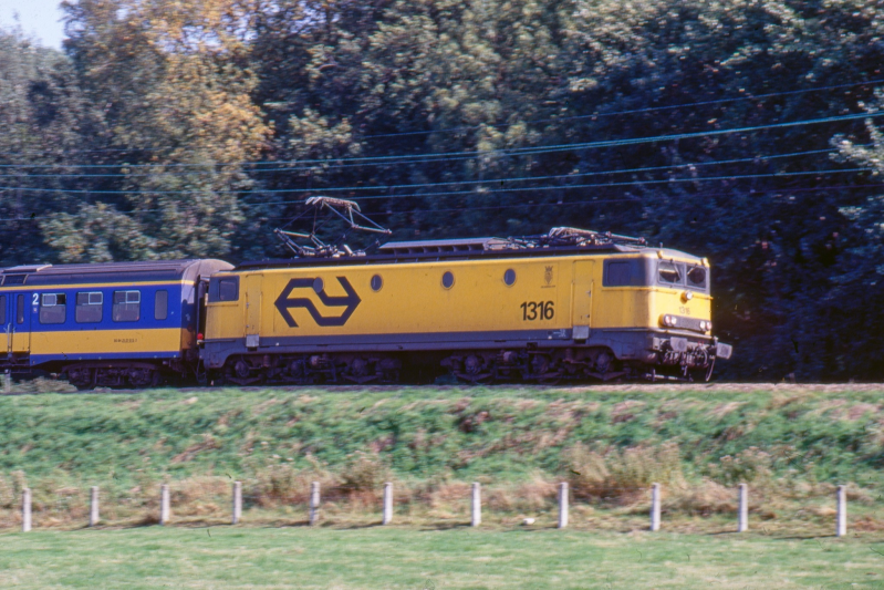 44. Electrische locomotief NS 1316 en Plan W rijtuig. "Meegetrokken foto" en daardoor achtergrond vaag en snelheidsbeleving.