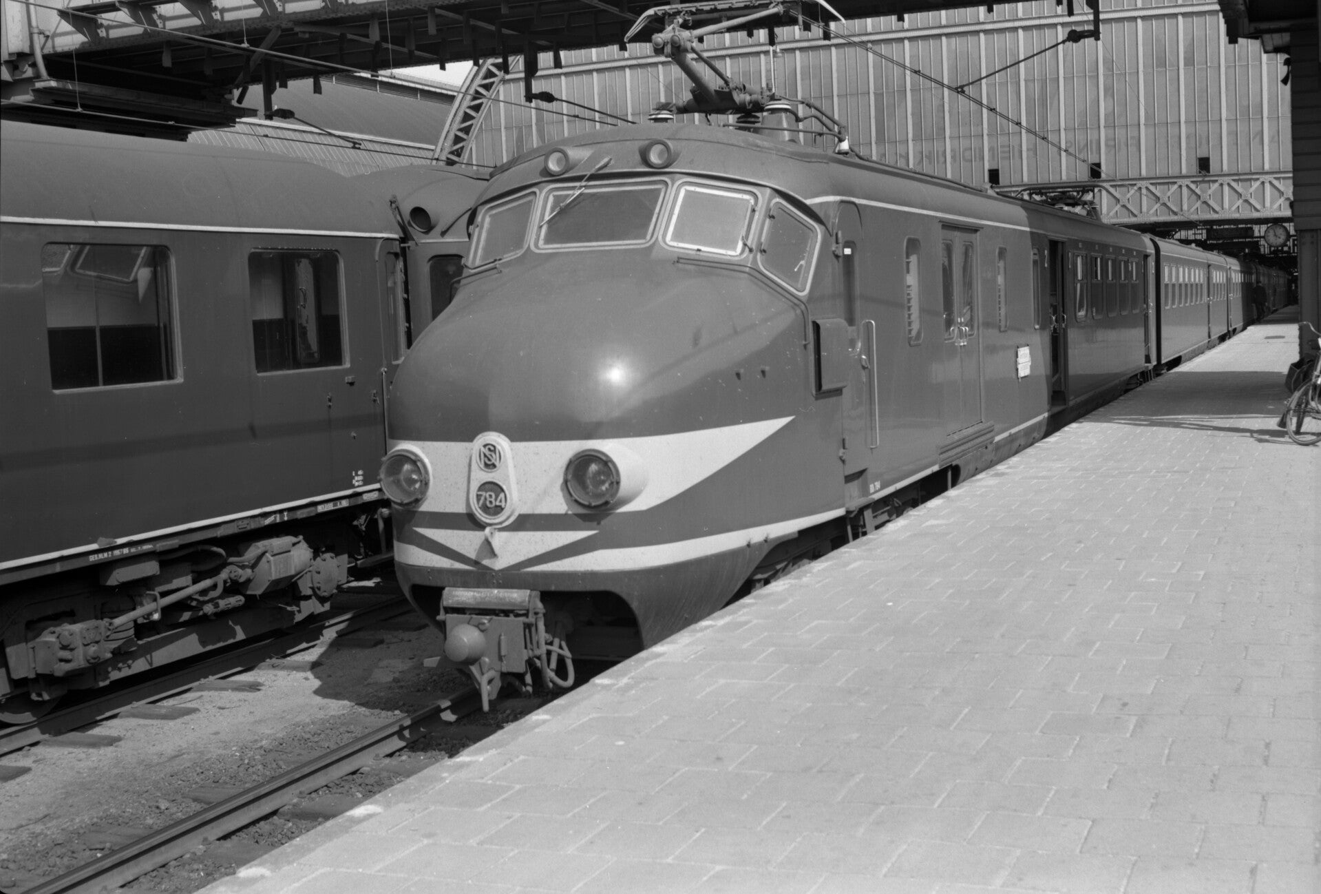 6. Catalogusnummer: 849604. Het electrische treinstel nr. 784 (Mat. '54, plan P) van de N.S. langs een perron van het N.S.-station Amsterdam C.S. Datering: 26 juni 1962. Foto: Nederlandse Spoorwegen - Het Utrechts Archief / hetutrechtsarchief.nl
