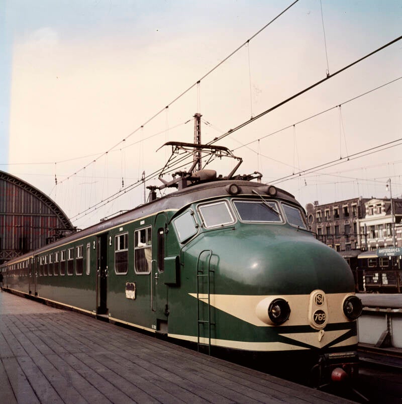 12. Catalogusnummer: 883121. Electrische treinstel nr. 768 (Mat. '54, plan P) van de N.S. op het N.S.-station Amsterdam C.S. te Amsterdam. Datering: September 1960. Foto: Nederlandse Spoorwegen - Het Utrechts Archief / hetutrechtsarchief.nl