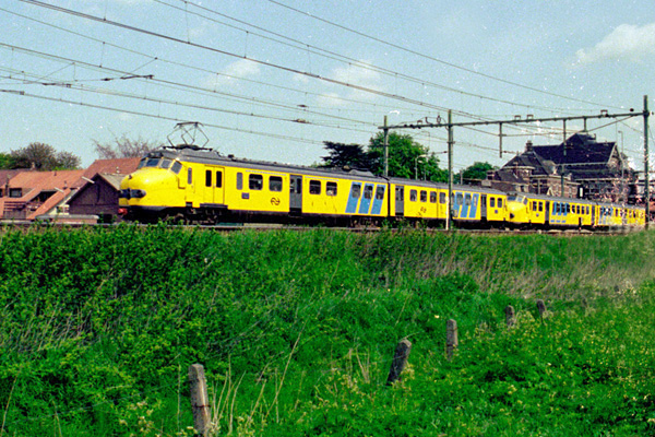 16. Woerden, 10 mei 1982. Twee gele Hondekoppen, Mat. '54, richting Gouda. Foto: Nico Spilt - Langs de rails / nicoispilt.com