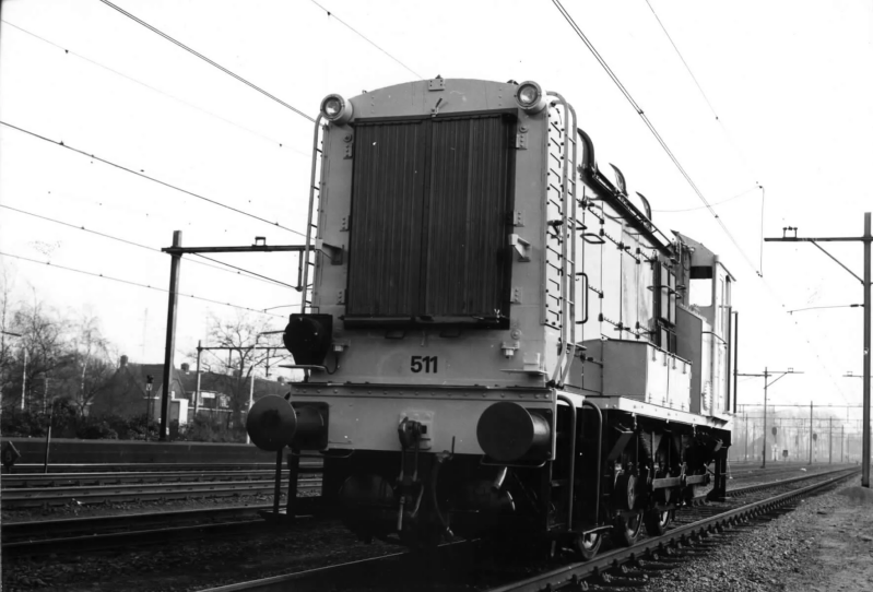 27. Catalogusnummer: 151534. De diesel-electrische rangeerlocomotief NS 511 (serie NS 500) in nieuwe huisstijlkleuren op het emplacement te Boxtel. Datering: Ergens in 1972. Foto: Nederlandse Spoorwegen - Het Utrechts Archief / hetutrechtsarchief.nl  Licentiestatus: CC0 1.0 Publiek Domein Verklaring