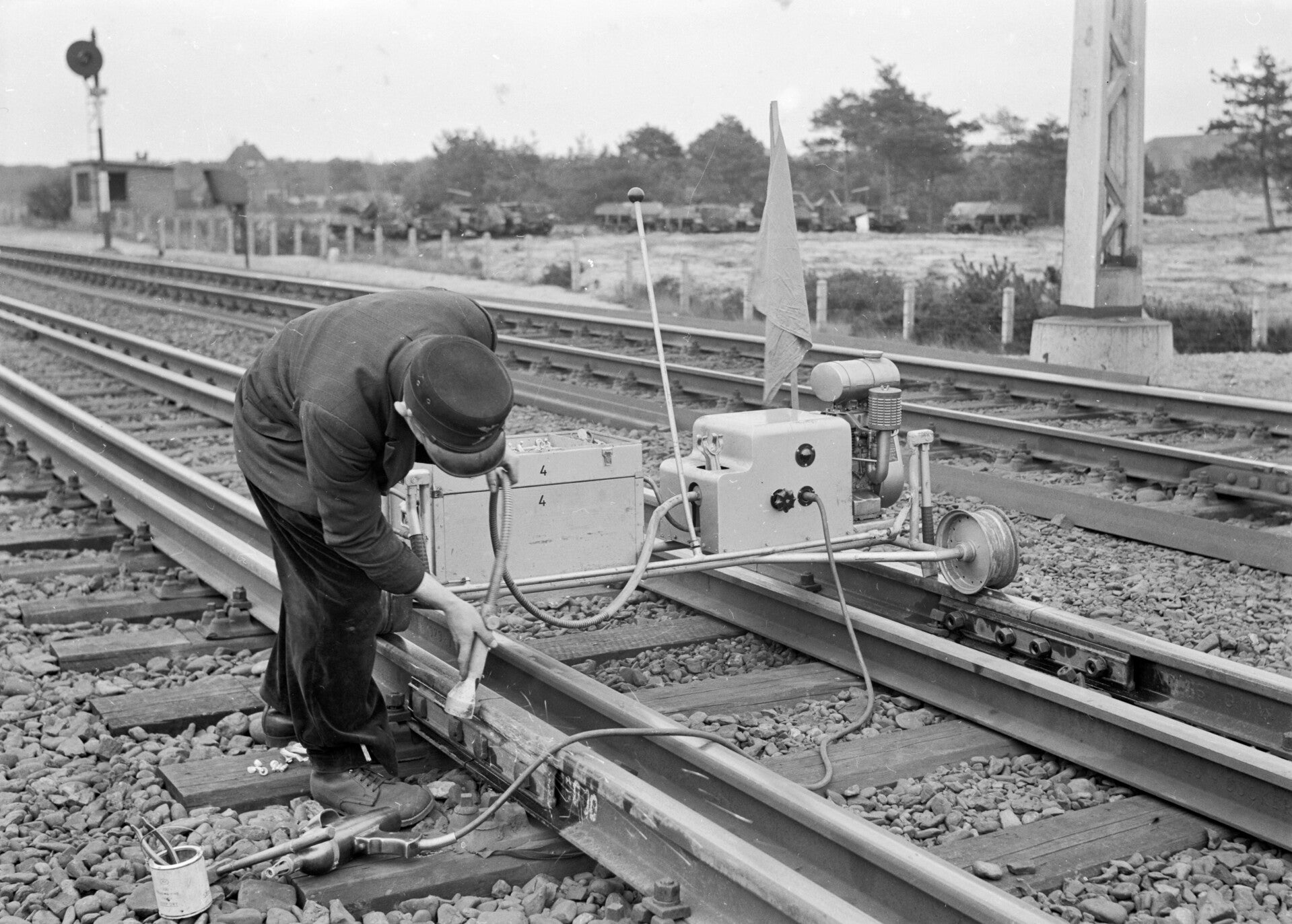 13. Catalogusnummer: 167341. Een spoorwegwerker van de N.S. tijdens het bijslijpen van een raillas in de spoorlijn te Wezep.