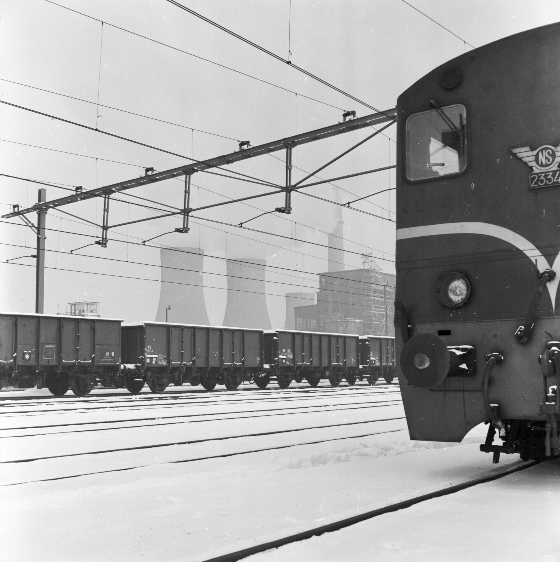 22. Catalogusnummer: 159803. Open goederenwagens van de N.S. voor het vervoer van steenkolen op het besneeuwde emplacement te Heerlen. Op de achtergrond een gedeelte van de Oranje Nassau-mijn en rechts een gedeelte van de diesel-electrische locomotief NS 2334 (serie NS 2200/2300). Datering: 26 januari 1961.