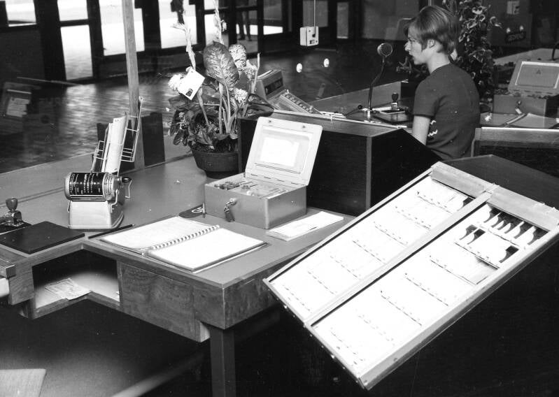 3. Catalogusnummer: 837069. Interieur van het nieuwe N.S.-station Eindhoven: plaatskaartenkantoor. Datering: 9 augustus 1956.