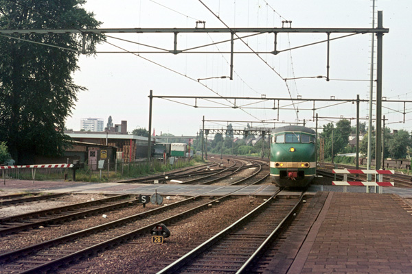 3. Naarden-Bussum, 26 juni 1973. Treinstel 515 komt over spoor 3 het station binnen uit de richting Amsterdam. Vanaf het perron kon je toen nog niet op de overweg komen, althans niet legaal. De overweg in de Zwarteweg/Comeniuslaan is later flink verbreed en er kwam toen ook een extra spoorboompje aan de kop van het perron. Op de achtergrond de grote seinbrug met inrijseinen.