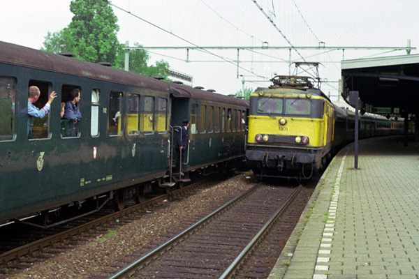 4. + 5. Naarden-Bussum, 21 mei 1994. Loc 7742 'Bello' van de SHM is met een aantal Zwitserse rijtuigen op weg naar Utrecht. De trein wordt ingehaald door loc 1301 met een trein naar Duitsland. Foto's: Leo Spilt, collectie Nico Spilt - Langs de rails / nicospilt.com