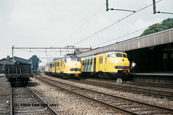 6. Naarden-Bussum, 15 juni 1974. Jarenlang een gebruikelijk beeld: een intercity die een stoptrein passeert. Links treinstel 346 op spoor 4, rechts een onbekende Plan V op spoor 3. Foto: Fons van der Jagt, collectie Nico Spilt - Langs de rails / nicospilt.com