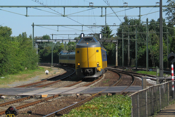 8. Naarden-Bussum, 15 juli 2003. Koplopers op weg naar Amersfoort en verder. De maximumsnelheid in deze boog was 80 km/uur. Sinds de verbouwing in 2019 zijn er nog maar twee sporen over en is de boog ruimer gemaakt, zodat de treinen 130 km/uur mogen.