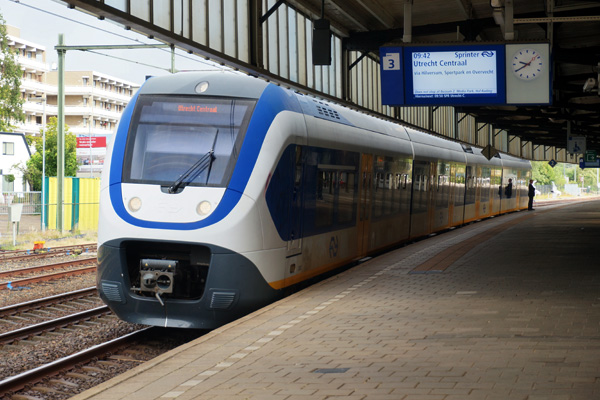 11. Naarden-Bussum, 2 augustus 2019. Een sprinter op weg naar Utrecht. Spoor 3 en de sporen hier links van zijn bij de verbouwing allemaal verdwenen. Foto: Nico Spilt - Langs de rails / nicospilt.com