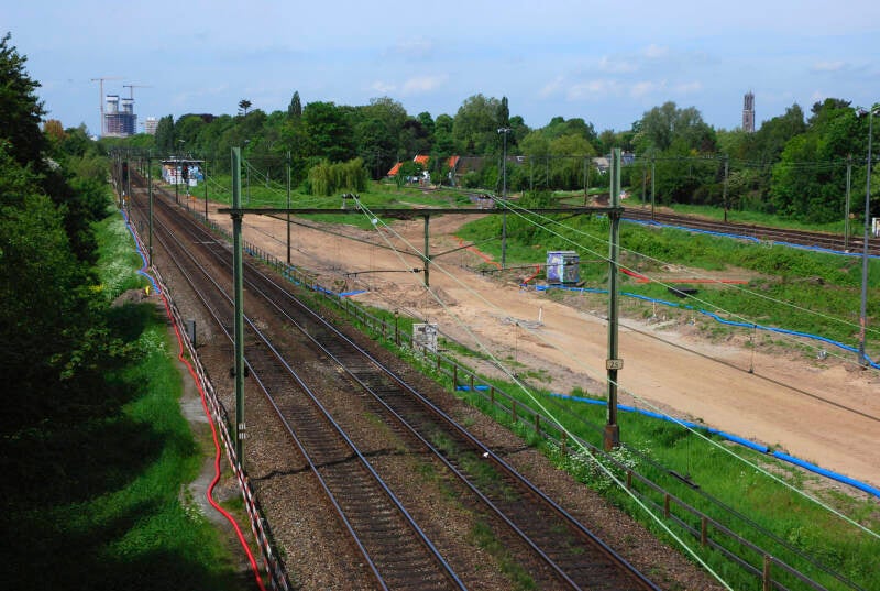 9. Catalogusnummer: 900401. De spoorlijn Utrecht-'s-Hertogenbosch te Utrecht, bij Lunetten Aansluiting, vanaf het viaduct in de Waterlinieweg, met de onlangs verwijderde opstelsporen en aansluiting richting Blauwkapel. Datering: 9 mei 2009.