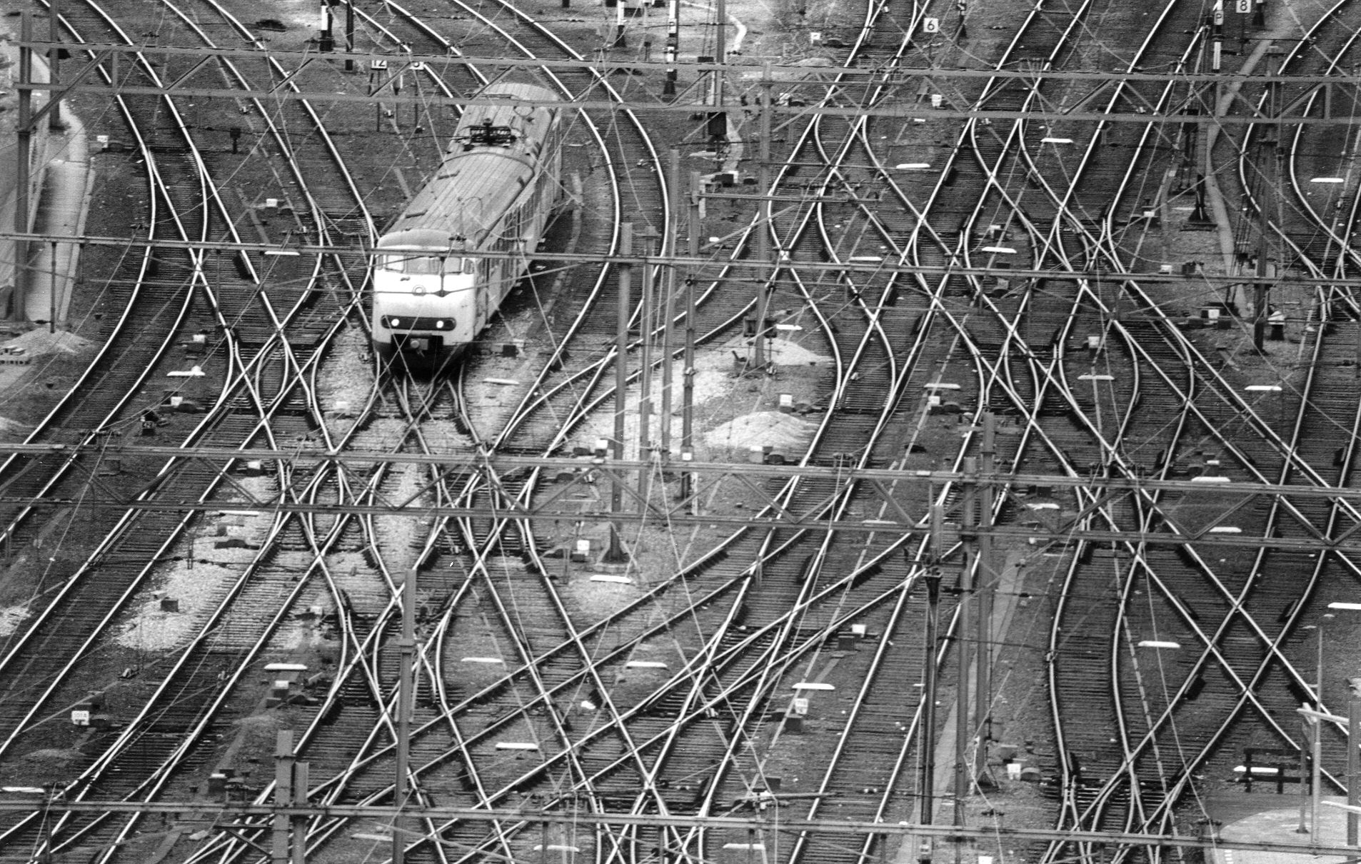 29. Catalogusnummer: 168879. Een gedeelte van het emplacement aan de zuidzijde van het N.S.-station Utrecht C.S. te Utrecht, met de rangeerpost, een aantal wissels met omzetstoelen met mechanische overbrenging over langere afstanden.