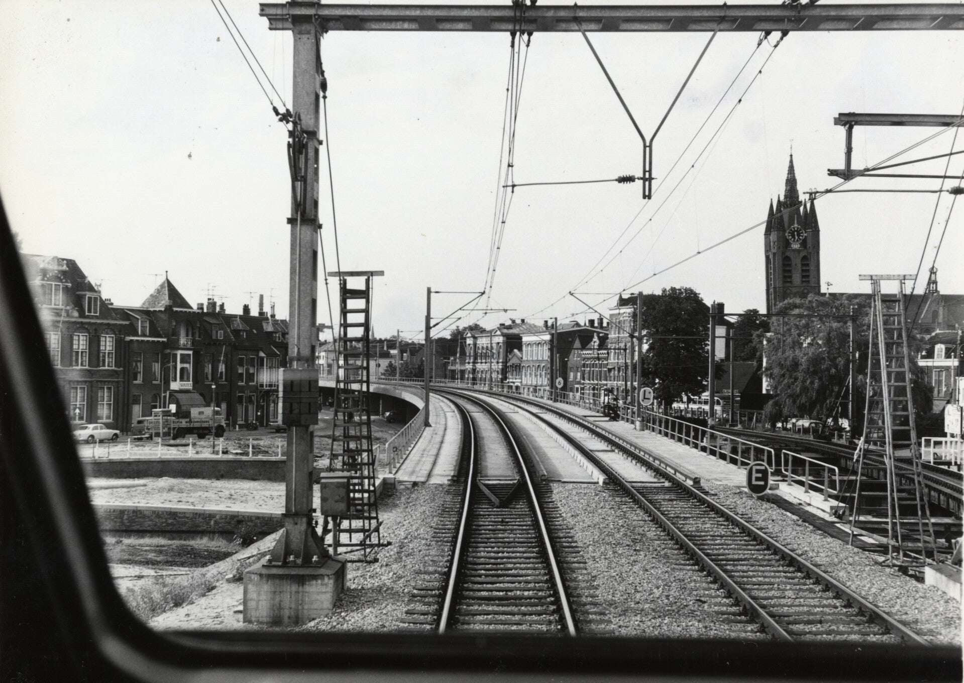 4. Catalogusnummer: 168611. Het viaduct van het in aanleg zijnde hoogspoor door Delft, ter hoogte van het Bolwerk, met links een electrisch treinstel mat. 1940 van de N.S. op het lage (hulp-)tracé. Rechts op de achtergrond het perron van het N.S.-station Delft.