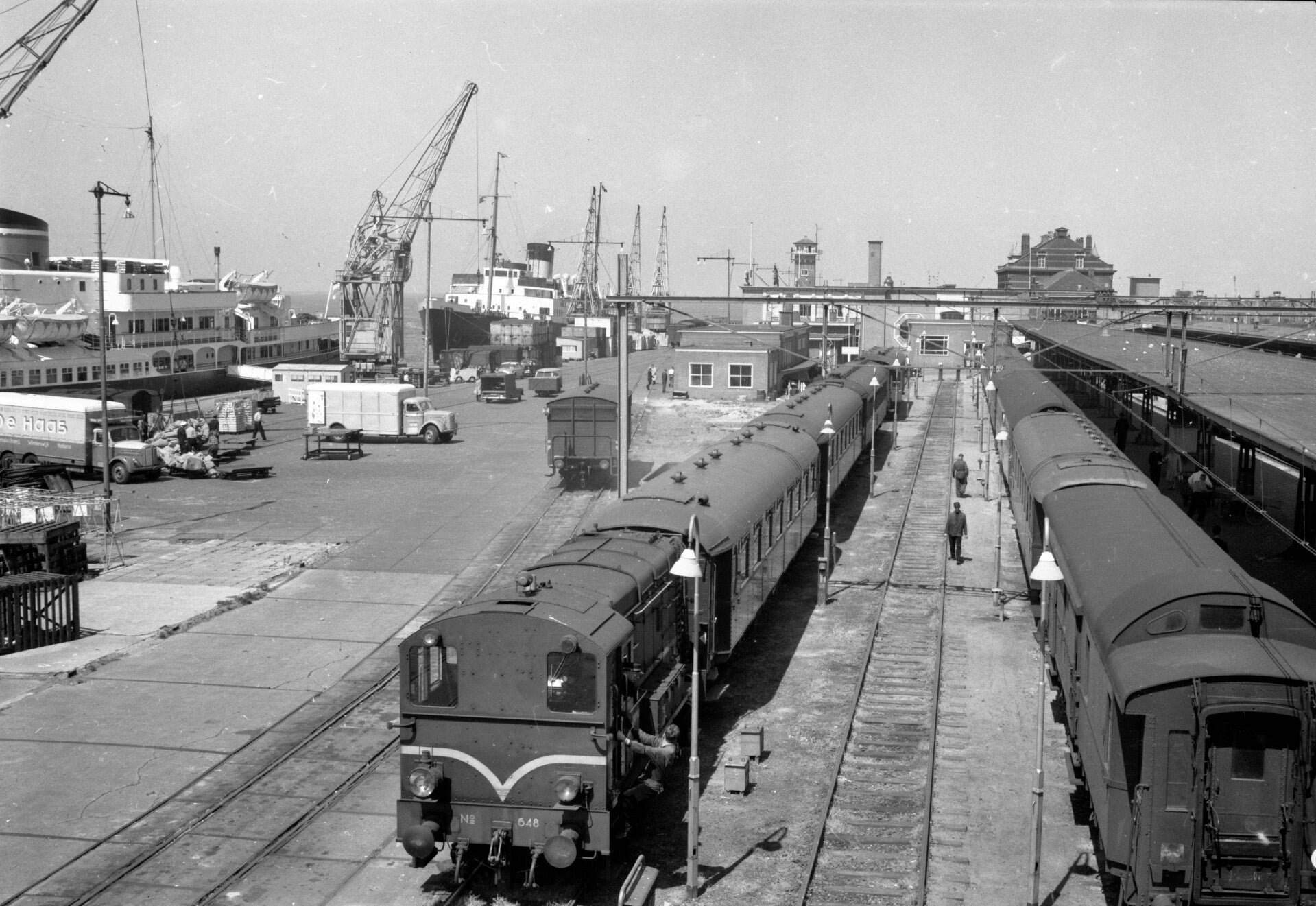 9. Catalogusnummer: 154990. Het emplacement van het N.S.-station Hoek van Holland Haven te Hoek van Holland met de diesel-electrische rangeerlocomotief NS 648 (serie NS 600) met diverse rijtuigen. Datering: 17 juni 1959.