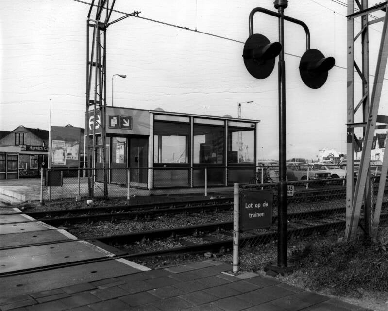 7. Catalogusnummer: 150447. De wachtruimte met plaatskaartenautomaat bij het N.S.-station Hoek van Holland Haven (Hoek van Holland Dorp) te Hoek van Holland. Datering: April 1975. Foto: Nederlandse Spoorwegen - Het Utrechts Archief / hetutrechtsarchief.nl Licentiestatus: CC0 1.0 Publiek Domein Verklaring