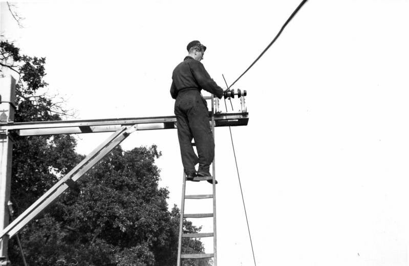 12. Catalogusnummer: 164301. Een monteur van de N.S. tijdens de electrificatie van de spoorlijnen in Limburg, ter hoogte van Susteren. Datering: Tussen 01-01-1948 en 31-12-1948.