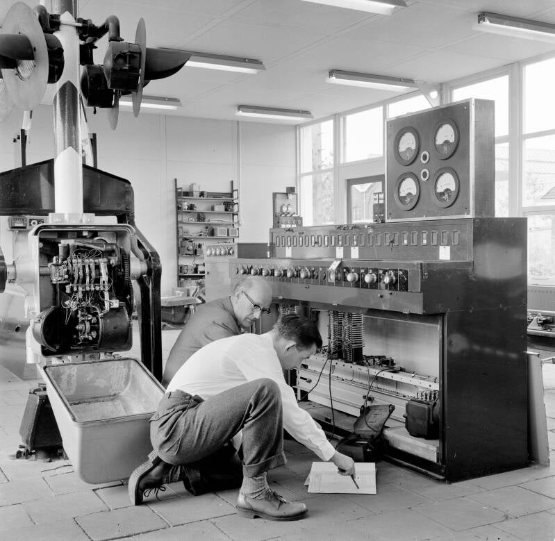 50. Catalogusnummer: 856696. Twee elektriciens van de N.S. bij een stelknoptoestel, vermoedelijk in een van de werkplaatsgebouwen van N.S. aan de 2e Daalsedijk te Utrecht. Datering: December 1965.