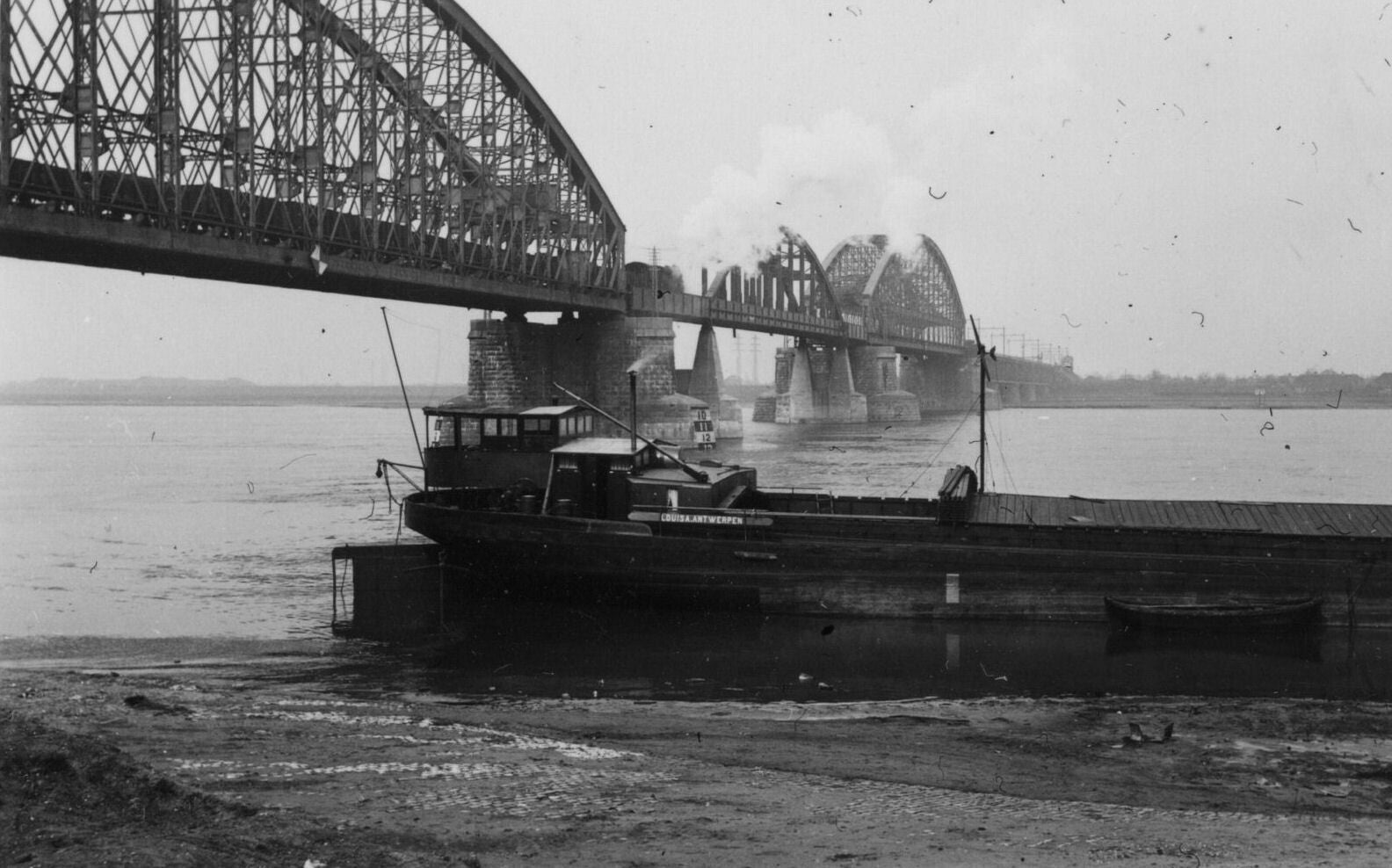 30. Catalogusnummer: 161795. De (provisorisch) herstelde spoorbrug over de Waal te Nijmegen.