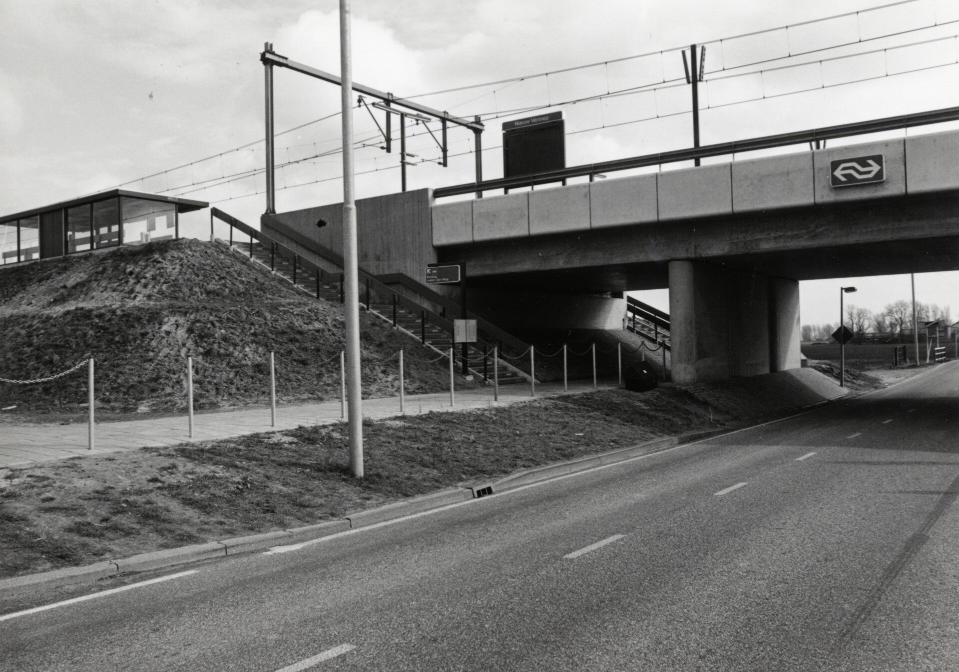31. Catalogusnummer: 169134. Het spoorviaduct over de Venneperweg te Nieuw Vennep, met links de opgang naar één van de perrons van het N.S.-station Nieuw Vennep. Datering: Tussen 01-01-1982 en 31-12-1982.
