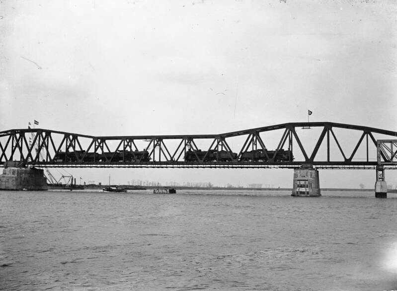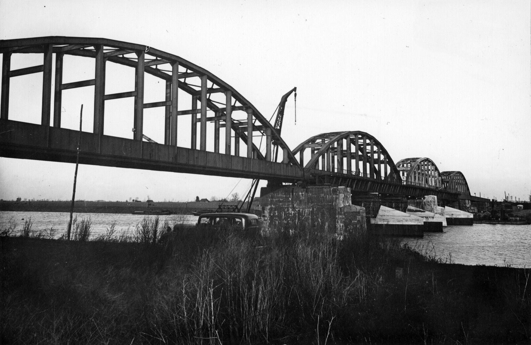 22. Catalogusnummer: 153552. De spoorbrug over de Rijn bij Oosterbeek met een goederentrein. Datering: 21 april 1953.