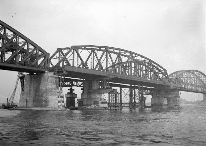 19. Catalogusnummer: 160684. De in herstelling zijnde spoorbrug over de Maas bij Venlo.