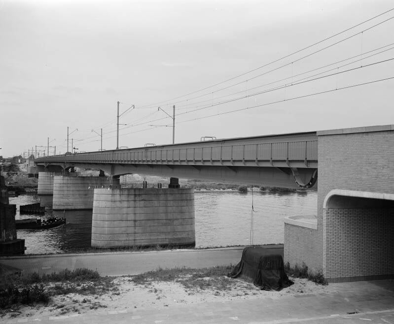 16. Catalogusnummer: 153619. De nood-spoorbrug over de Maas bij Venlo. Datering: Augustus 1963.