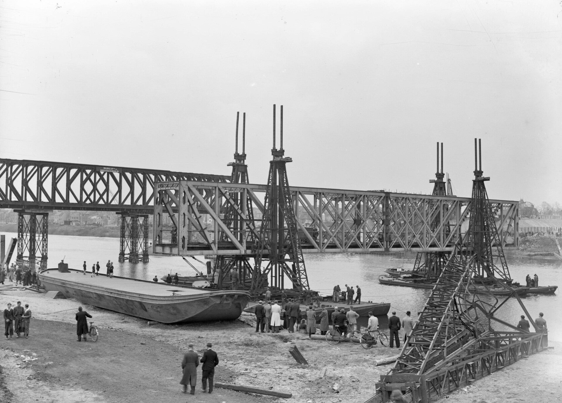 29. Catalogusnummer: 803465. Het invaren van een nieuw brugdeel voor de spoorbrug over de Waal te Nijmegen.