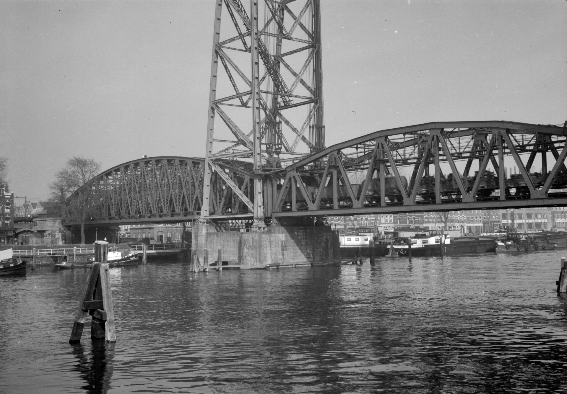 28. Catalogusnummer: 153564. De spoorbrug over de Koningshaven (Koningshavenbrug) te Rotterdam met een goederentrein.